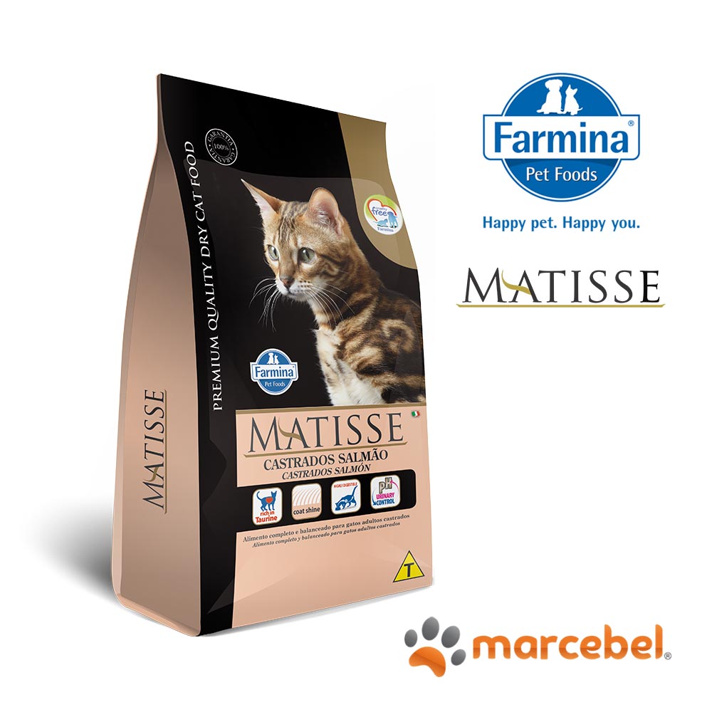 Matisse Castrados Salmão es un alimento completo y balanceado desarrollado especialmente para atender las necesidades de los gatos castrados. La castración trae cambios importantes en el metabolismo del gato y una dieta adecuada se hace necesaria.